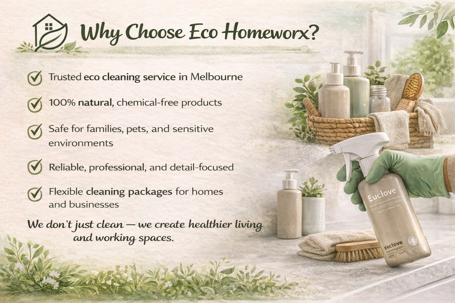 At Eco Homeworx, we provide professional, eco-friendly cleaning services across Melbourne, helping homes and businesses enjoy cleaner spaces without compromising health or the environment.